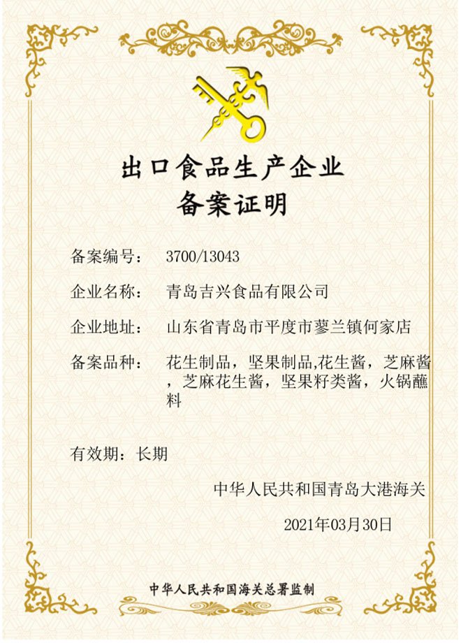 青島吉興食品有限公司,位于青島平度市,始建于2002年,是一家聚焦專注于花生深加工的食品企業(yè)。公司董事長(zhǎng)于松魁先生從事花生產(chǎn)業(yè)深加工研究30余年,并將花生產(chǎn)業(yè)作為畢生事業(yè)。公司所生產(chǎn)花生醬研磨細(xì)度可以達(dá)到300目以上,擁有規(guī)范的現(xiàn)代化生產(chǎn)廠房、先進(jìn)的技術(shù)生產(chǎn)線及專業(yè)管理團(tuán)隊(duì)。